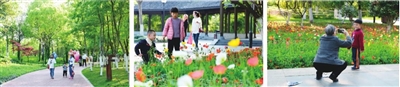 “弟弟快看,这里有蜗牛!”一对姐弟迈着欢快的步子跑到花坛边,低下头,认真注视着地上拖着壳旅行的蜗牛,还有排着队搬运食物的蚂蚁,感受春日里蓬勃的生命力。不远处,一位老奶奶举着手机为孙子拍照,孩子的笑容和背后的鲜花一样灿烂。草坪上坐着不少前来野餐的游客,有人躺成“大”字晒太阳,有人戴着草帽穿着公主裙“凹造型”,还有人悠闲地举着玩具吹泡泡……
