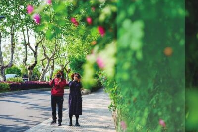 在二环北路、北山路上,一丛丛蔷薇迎着暖阳绽放,粉色的蔷薇有的初开、有的浓烈、有的含苞待放,在绿叶的陪衬下,显得娇小玲珑,微风吹过,低垂的枝条随风摇曳出一地的浪漫,阵阵花香弥漫,吸引了来往的行人驻足赏光、打卡拍照。市民王丹爱好摄影,她告诉记者,自己就住在附近小区,出门散步时发现蔷薇已经开了,连忙通知朋友带上化妆品和道具,一起在花墙前拍摄人像。