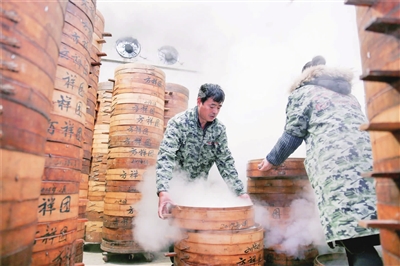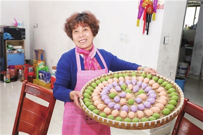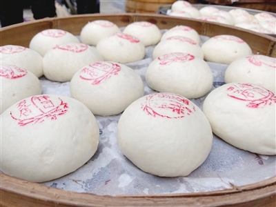 屋外寒风习习,屋内热火朝天,位于罗店镇的方祥团全家出动,忙着制作红印馒头。红印馒头是金华的特产,是过年桌子上必备的一道美食,加上刚刚出炉的扣肉、笋干混在一起,美味可口,香气扑鼻。红印馒头松软、香甜,略微带点酸味,是餐桌上的上好点心,吃起来松软不黏牙,极易消化。金华的圆馒头,在传统习俗中有“团团圆圆、蒸蒸日上”的寓意。
