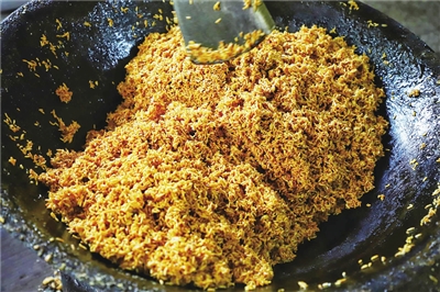 老字号“冻米糖饼坊”已经开了二十年了,小小的店面只有夫妻二人经营,做冻米糖是他们的终生事业。将糯米和着红糖、杏仁、花生等各种食材在铁锅内翻炒,精心控制着火候以确保糖油能处在做馒头最恰当的状态,翻炒完毕后迅速出锅压制切糖。冻米糖甘之如饴,是幸福的象征。在早年的金华民间,还流传着“担年糖”的习俗。每逢年关,婆家要将各式各样的年糖送到下过聘、定了亲的闺女家,再由女方分送给亲戚和左右邻居。