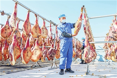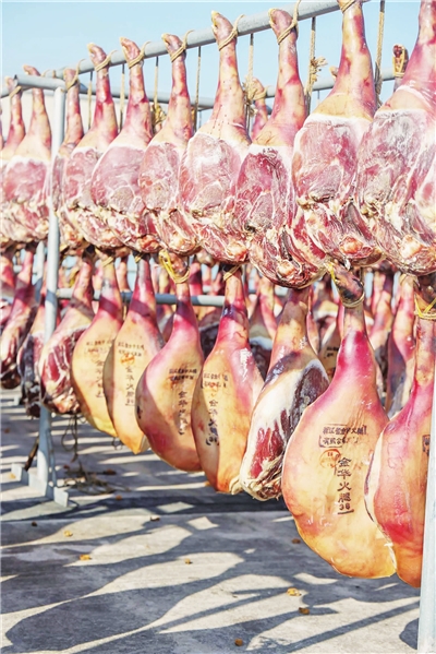 婺城区雅畈镇大拇指火腿食品股份有限公司的晒场上弥漫着浓郁的芬香,趁着晴好天气,工人师傅们正忙着将火腿翻面晾晒,充分风干的火腿更有利于接下来的发酵。金华火腿采用两头乌猪的后腿腌制而成,经过上盐、整形、翻腿、洗晒、发酵、风干等传统工艺一步一步精制而成,其中洗晒是金华火腿传统制作技艺中的一个环节,洗干净的红肉面朝着太阳,晴天阳光下晾晒一星期,火腿皮面由白变红,再上架发酵。金华火腿的生产过程漫长,大约在100天左右,这种传统工艺已经成为国家级非物质文化遗产。