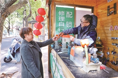“现在城市里的修理铺已经越来越少了,家里东西坏了要‘小修小补’都不知道去哪里,有了这个便民服务点,走路5分钟就到了,真的是太方便了。”社区居民林春红就住在朝阳街,她告诉记者,“家门口”的便民服务点不仅带给居民很多便利,收费也很合理,配钥匙6元、补轮胎5元……这么多年一直都没有涨过价,很受周边居民的欢迎。