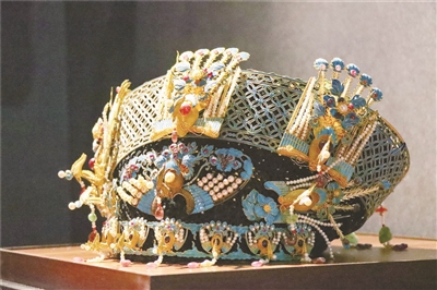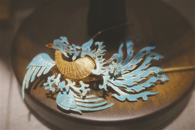 “这顶凤钿是皇后大婚所用,即便在清宫宫廷也属罕见,其中融合了点翠与花丝镶嵌两大工艺,工程极为浩大。”黄分回介绍道,点翠工艺已有两千多年历史,以翠鸟羽毛缀于金银胎底,流光溢彩;花丝镶嵌则以金丝银线编织成型,再嵌宝缀珠,与点翠相映生辉,互为表里。