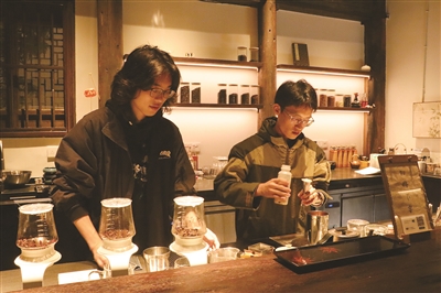 吧台前,主理人陈邻恺和任铭晨忙碌地调制着特色茶饮,茶香氤氲间,为这个历史街区平添一缕现代活力与烟火气。