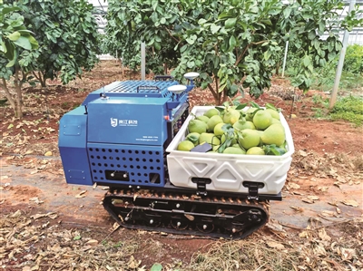 11月25日,在婺城区白龙桥镇的景迪生态果园里,一台蓝色履带式农业搬运机器人正穿梭于果树之间。爬坡、越坑、蹚草地,它如履平地,搬运起刚采摘的柚子更是轻松自如。
