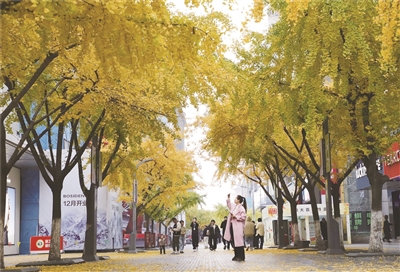 近日,婺城区西市街步行街迎来了一年中最绚烂的时节。街道两旁,银杏树披上金黄的“新装”。行人或驻足欣赏,或举起手机拍照,在这金黄的世界里流连忘返。
