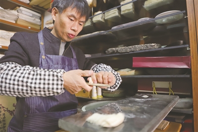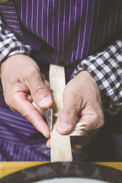 如何将这门手艺传下去?陈小高的想法很简单,首先自己要能做出真正的好笔,才谈得上真正的传承。除了打理店铺,他几乎把所有的时间都花在了做笔上。狭长的店铺里,有一张小小的工作台,台面上放着一盆清水、一块岩板、若干毛梳、几把刻刀……一有空,他就在这里埋头制作毛笔。除此之外,还可以看到一串串阴干的笔头,放在石灰上脱脂的动物毛,用来封笔的海藻胶。