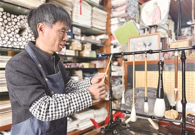 凭借自己的手艺,他为各书画家和书画爱好者量身定制毛笔。如今,许多客人进店,总爱与他切磋交流。陈小高话不多,却总能用专业与诚意,帮助客人找到最合心意的文房用品。笔庄的生意,也渐渐步入佳境。这家店也成了陈小高家族世代制笔技艺的展示窗口,他也顺利地在金华安了家,和妻子共同打理着这家店。