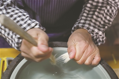 “做毛笔是细活,心一定要静。”说话间,陈小高取出一捆羊毛,这是一位客人特地拿来定制毛笔的原料。“现在要从里面挑出有笔锋的毛。”他专注地一根一根挑选,最终理出一小撮锋颖完好的毛,放入水中细细梳洗,去杂取顺。梳好的毛还需将根部竖立于石灰中脱脂,历时一天一夜。而这,仅仅是漫长工序的开始。从选料到成笔,制作一支毛笔须经大大小小128道工序,前后往往耗费十多天的时间。