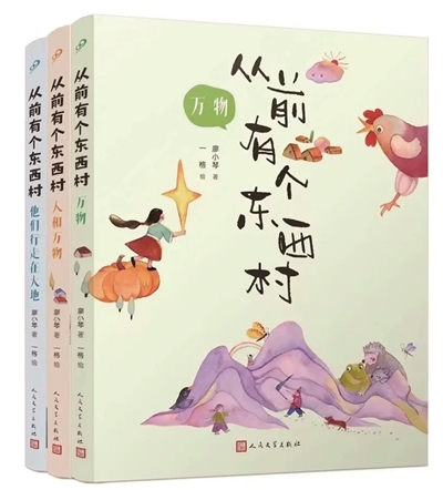 在自己创作的一系列童话故事中,她最满意的是《从前有个东西村》。这是一套创世童话,她视这套书为她的突破之作,共三本,2024年1月由人民文学出版社出版。这套书融合中国神话和民间文学的创作手法,构建出一个世界诞生之初,人与万物共存的东西村。在《万物》中,讲述日、月、火、光和山川河流等如何在东西村诞生,呈现出世界诞生之初的纯真、自在,传递出故事的力量;《人和万物》里,讲述出人初遇万物时的天真和诗意,呈现出人与物、人与世界原初的单纯和美好;《他们行走在大地》则讲述了世界之初,神行走在东西大地,人、神、万物,彼此往来、彼此照护,为读者构建出一个人类童年的桃花源。