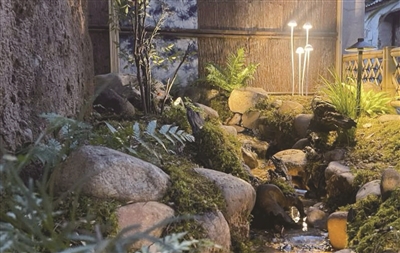 在他看来,庭院不仅是视觉景观,更是主理人理念的延伸与功能的载体。“比如陶笛馆,强调实用性与艺术性的统一。我以枯山水为基调,融入陶笛元素,营造宁静禅意。”柯俊雄一一介绍,“而婺州染坊则保留原有土墙和粗粝质感,把山间小景搬进院中,再结合布艺,突出手工感与岁月痕迹。”
