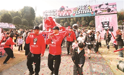 当天上午,在熊猫猪猪园区大门前,随着鼓声渐响,“年猪大巡游”拉开序幕。队伍最前方是牧场的“形象大使”——憨态可掬的熊猫猪猪人形玩偶,腾跃翻飞的舞狮队紧随其后,象征着雄狮贺岁的吉祥寓意,在大家的簇拥下向园区舞台行进。