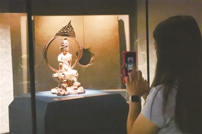 1956年底,解放军驻金某部队在塔基原址整修场地时,意外发现了塔下地宫。1957年1月1日,考古工作者启动对地宫的抢救性发掘,清理出经幢、金佛造像、金涂塔等35类共188件珍贵文物。其中,五代鎏金铜水月观音像高53厘米,造型优美、神态安详,被列为国家一级文物,1959年调入国家博物馆珍藏。2025年9月26日,“万相重光——浙江佛教艺术千年大观”展览在金华市博物馆启幕,时隔15年,水月观音像第二次“归乡省亲”,点燃了市民与游客的热情。参观者们或驻足凝视、轻声赞叹,或举机定格国宝神韵,不少文物爱好者专程慕名而来,只为一睹这件出自万佛塔地宫的瑰宝真容,成为一时热议的文化盛事。