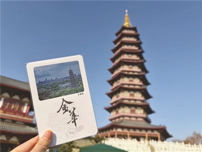 走进塔内,仿佛踏入一条跨越千年的时光隧道。每层均设有特色主题展陈,万尊小佛像神态各异、栩栩如生,顶层重达11.8吨的祈福大钟上,清晰镌刻着“风调雨顺”四个大字。“最震撼的就是站在15层俯瞰全城,古子城的青石板路、婺江的粼粼波光、远处的现代高楼尽收眼底,古今金华的韵味在这一刻完美交融。”来自福州大学的小敏和同学们趁着假期畅游金华,第一站便直奔万佛塔,从塔顶下来时,手机里早已存满了不同角度的塔景照片,言语间满是赞叹。