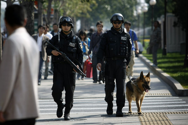 2009年9月23日,“蓝剑突击队”在北京市街头持枪携警犬在长安街上执勤,以保国庆60周年安全。