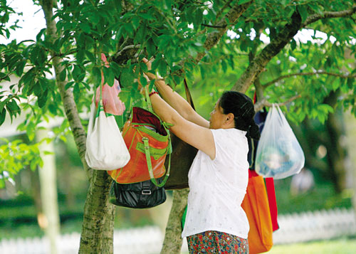 近日,记者在市区婺州公园看到,不少健身的市民将随身携带的包挂在树上,有些树枝因负荷过重都被压弯了腰。