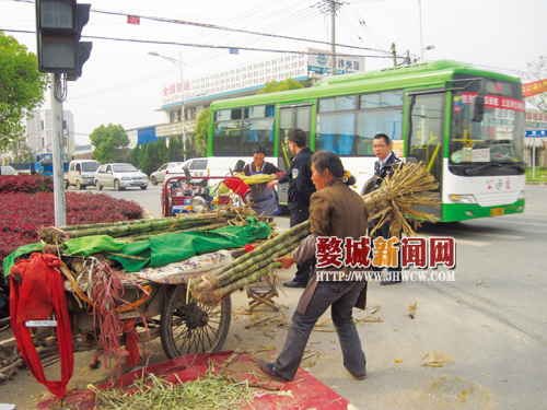 无独有偶,昨日,记者又在环城西路与长湖路的交叉口看到几位拉着三轮车摊卖甘蔗的农民。因为他们的临时“小摊”占据了马路的人行道或非机动车道,围上前购买甘蔗的顾客不得不站在马路中间,来往车辆贴身而过,非常危险。所幸辖区行政执法队员及时赶到现场,劝走了这几位叫卖甘蔗的农民,及时消除了这一道路安全隐患。