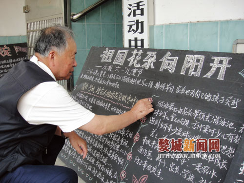 两张椅子并在一起,上面放一块四方涂黑小板,一手拿着一本染着各种颜色粉灰的小册子,一手捏着一只两寸长的粉笔,吱吱喳喳的声响下,一期图文并茂、内容新颖的黑板报就完成了,家住城西街道二七花园社区的75岁老人钟守斌,50多年的板报生涯让他见证时代巨变。