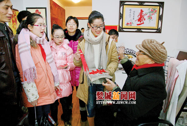 为加强学生思想品德教育,让学生心怀感恩,养成尊老敬老的良好品德和文明习惯,把学习《弟子规》付诸于行动中,浙江师范大学婺州外国语学校将金华市社会福利中心作为了学生践行《弟子规》德育教育基地。昨天上午,在市社会福利中心里,两家单位举行了践行《弟子规》德育教育基地揭牌仪式。浙师大婺州外国语学校的学生们与福利中心的老人们一同上演了精彩的文艺汇演,随后学生们兵分多路,到福利中心住养楼里,给老人们送去水果、食品和自制的新年贺卡、剪纸,陪老人聊天,听老人讲过去的趣事。