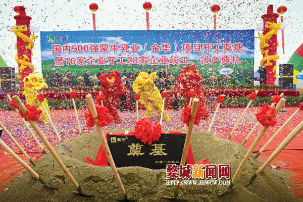 2月21日,投资9亿元的蒙牛乳业金西项目正式开工奠基,陈一新宣布开工。自此,金西大地已将国内两大进入500强的乳业巨头企业双双揽入怀中,为素有华东第一乳业之乡的金华带来新的发展机遇。该项目将引进国际最先进的乳品处理和灌装设备,采用全过程在线质量监控系统,力争以一流的管理、一流的质量,建成为蒙牛全品项样板工厂。