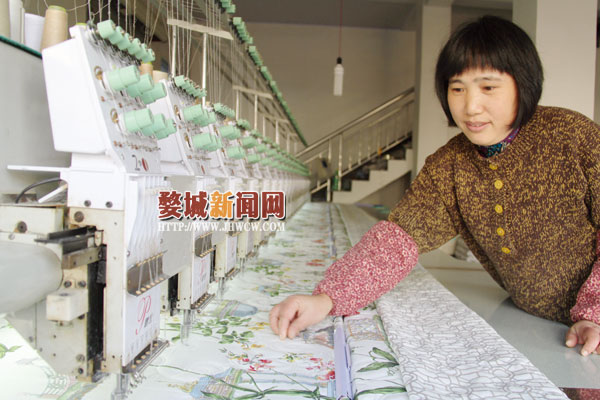 日前,汤溪镇寺平村的鑫鸿纺织工艺厂被单绣花的来料加工基地引进了新型的绣花机缝制被单,省时又省力。该厂负责人告诉记者,他们每天都有三百多台绣花机在运作,效益也不错,一床被子能买到200多元,主要销往美国、加拿大等地区。