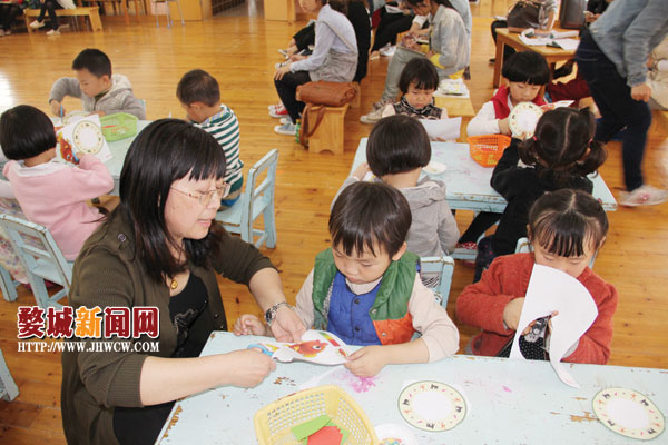的确,记者亲见洪小英上手工课,发现她和小朋友们一样,坐在一张小板凳上,让孩子们先和她带来的两个朋友“小猫”(教具)打招呼,然后循循善诱,让大家给客人小猫做好吃的——一盘红烧鱼。非常简单的课题内容“让孩子们把纸上的盘子、红烧鱼等图案剪下来”,可洪老师却让它成了一个童话故事,非常有趣,难怪可以“抓住”20多个小小孩的心,让课堂气氛既活跃又有秩序。
