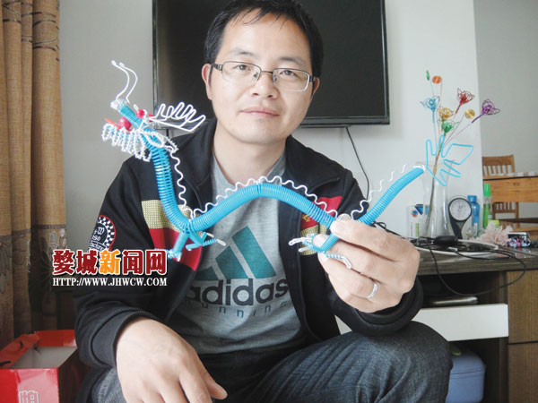 近日,在市区八一北街和中山路的地下通道口,或是工商城附近,人们常常能看见一位用五颜六色、粗细不同的铝丝制作各类形态逼真艺术品的手工师傅,一把剪刀、几付钳子就能把普通的铝丝绕成各式各样的物件,有造型别致的哈雷摩托车、情侣双人车、彩色自行车、三轮车、黄包车等,还有创意十足的机器人、情侣挂件、小车挂件、吉祥龙、爱心相座等,还能手编名字,个性定制手编玫瑰和时尚手工台灯等等,直让人们看花了眼。