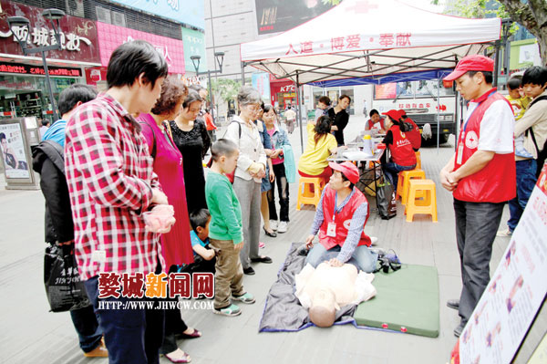 2013年5月8日是第66个世界红十字日,今年的主题是“携手人道,关爱生命”。昨日,婺城区红十字会在市区恒大百货门口的红十字志愿者宣传基地开展“5.8红十字日”与“纪念5.12”宣传和演练活动,现场进行急救救护知识普及、捐献骨髓和器官咨询、无偿献血、志愿服务宣传、志愿者招募、展板展示等活动。此次活动旨在传播国际红十字运动基本知识,传承红十字精神,启迪社会公益慈善意识,动员和凝聚更多的社会力量参与红十字事业,更好地帮助弱势人群。