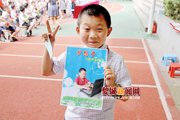 第二个节目是请学生代表介绍自己的梦想。“这是我的梦想卡,我要成为一名电脑编程师。”来自四年级(6)班的张裕宁拿着自己亲手制作的梦想卡走到了舞台中间,大声地向所有人说出了自己的梦想。