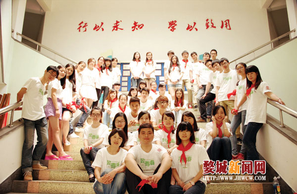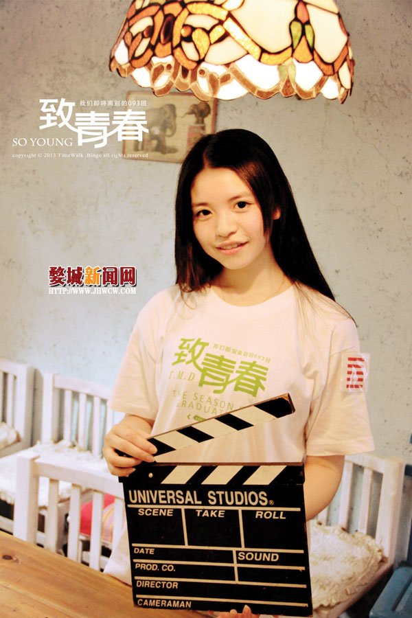 在确定拍摄主题后,班长翠翠在网上淘了46件款式相同的白色短袖棉T恤,接着由同学汪涛完成该T恤的个性化设计。“受最近热播的电影《致青春》的影响,电影里的某些元素成了我们现在这套班服的设计灵感来源。” T恤的正面,“致青春”三个字以及与英文的搭配,模仿了该电影片名的呈现方式。而在T恤的背面,汪涛巧妙地将全班45个人的名字有序地排进了代表3班的空心数字“3”中。至于第46件班服,它属于3班的班主任王老师。