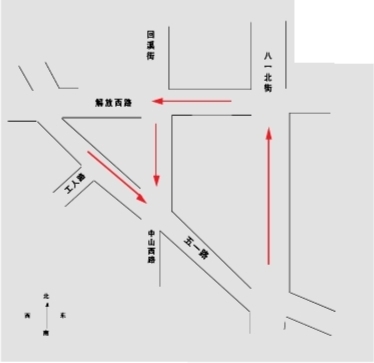 解放西路、五一路、八一北街围成的三角区域将实行逆时针方向的道路单行微循环(如左图所示)