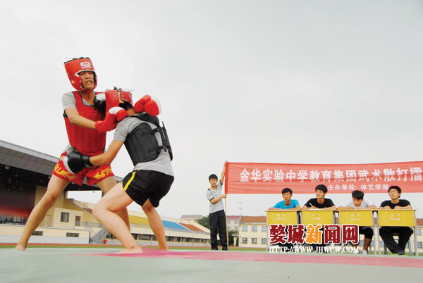 “快点!已经打起来了!”许多学生跑向操场看热闹。别急,这不是打架,而是金华实验中学教育集团体艺学部日前举办的文化周活动内容之一——武术散打擂台争霸赛,保安专业学生在文化周中进行了专业特色展示。