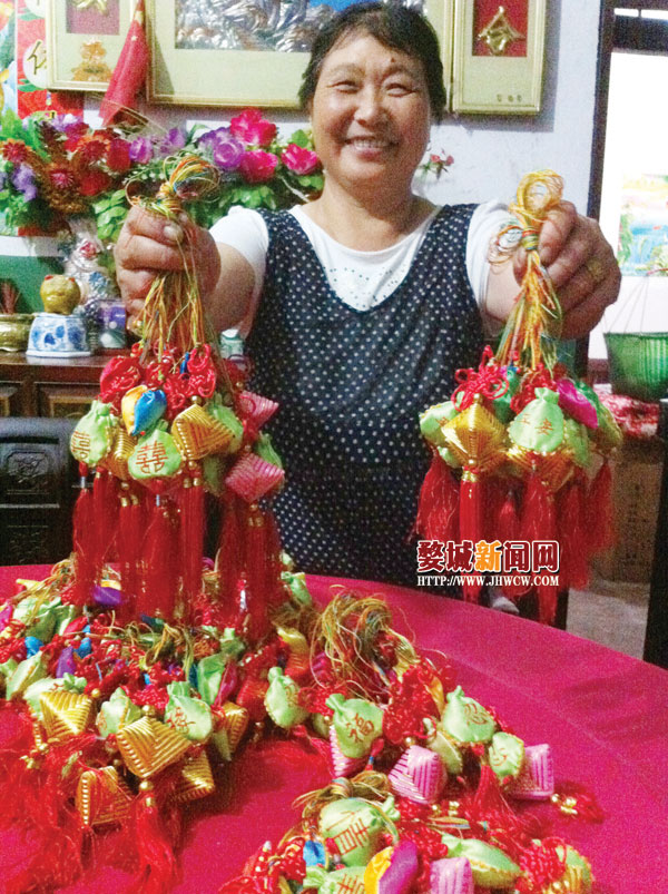 梁姣芝做香囊时,先在彩色绸布上绣上图案,然后包上棉花,里面参合着大米、茶叶、丁香、白芷等中药成分,再用针线缝合起来。下边还用黄、红、蓝各种彩线、珠子缀上穗子。每件作品都有寓意,牡丹代表富贵、五颜六色的粽子象征越来越富有,鱼戏莲寓意年年高……每逢端午,她都会亲手制作香囊,送给亲朋好友,还给娃娃做虎头鞋。