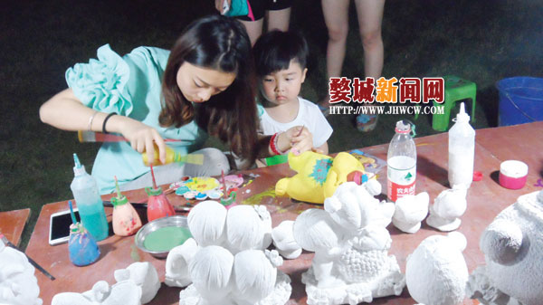 晚风徐徐,市区樱花公园的石膏白胚画像摊前,年轻母亲带着孩子为石膏白胚像添上美丽“外衣”。