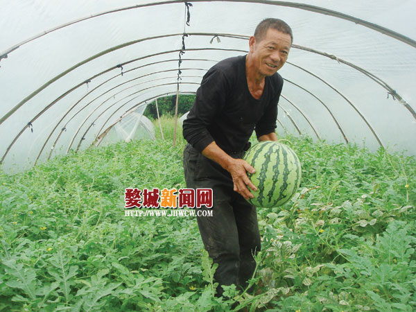 走近一个西瓜大棚,棚里的西瓜个个浑圆饱满,“我种了24亩大棚西瓜,每公斤批发价格在3元左右,本地大棚西瓜的销售时间在半个月左右。我的西瓜定向供应市区水果批发市场,他们看中的就是西瓜的口感,贵点也不在乎。”冯济财说。