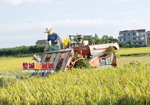 昨日,在罗埠镇莲湖杨村的稻田里,五台收割机同时忙碌着,其中一位机主称,他们来自江苏泰兴等地,每年七月份等候在罗埠镇,给邻近村庄农户收割稻谷,每亩收费90元。为了抢收抢种,近几年村里农户基本都租用外地收割机来完成收割任务。