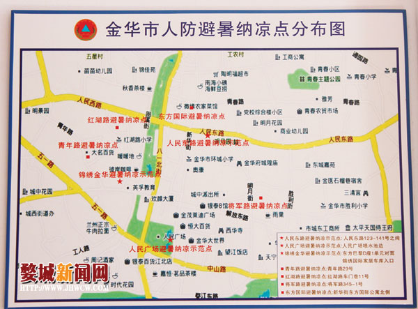 另外,除了人民广场处的防空洞,市区还开放了6个纳凉点,具体地址为:人民东路123~141号之间(原真爱舞厅)、锦绣金华(原锦绣国际家居地下停车场边)、青年路29号、红湖路车门巷11号、将军路345-1号、新华街东方国际公寓北侧,可供市民乘凉的人防工程面积共约4000平方米。每个开放的人防工程口部附近都设有明显指示牌,每个纳凉点有专门管理人员负责维护秩序、卫生清扫、安全管理等。纳凉点正式开放后,暂定到8月31日结束。每天开放时间为上午9点至晚上6点。