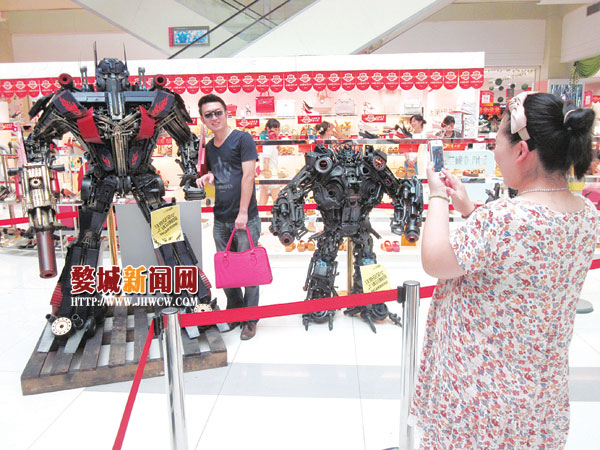 7月27日,银泰百货福华店举行第三届员工内购日,展示了汽车人、霸天虎等十多个变形金刚模型,吸引了不少市民的眼球,并与模型合影。