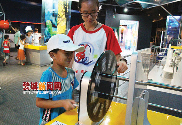 近日,浙师大社团联暑期实践队“启梦”爱心家教班的7名队员,带领20多名罗店儿童参观了浙师大科技馆,圆孩子们一个“科技梦”。当天,科技馆内琳琅满目的高科技展品、航天飞船、火箭和星空模型、珍贵的动物标本等,引起了孩子们极大的兴趣。他们争着向领队的大学生老师提出了各种问题,老师们则悉心解答并且引导孩子体验了馆内部分仪器。