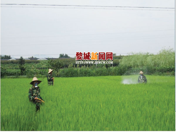 连续40多天高温干旱天气,造成许多病虫害发生量大,严重威胁水稻高产, 8月16日,婺城区琅琊镇能发粮食专业合作社技术骨干冒着高温为合作社社员喷施农药,防治水稻病虫害。据悉,琅琊镇充分发挥18家粮食专业合作社作用,全面实施农作物病虫害统防统治,达到了全覆盖,全镇统防统治面积2万多亩,比去年增加了2千多亩,不仅水稻病虫害实行了统防统治,茭白等蔬菜也实行了病虫害统防统治,为战高温、防病虫、保丰收打下了良好基础。