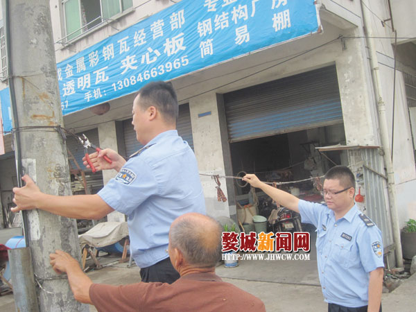 日前,金华市城市管理行政执法局婺城分局乾西中队对位于市区环城西路马路边行道树、电线杆上乱拉铁丝、绳索晾晒衣物等乱象进行整治,并对相关责任商家进行了教育。