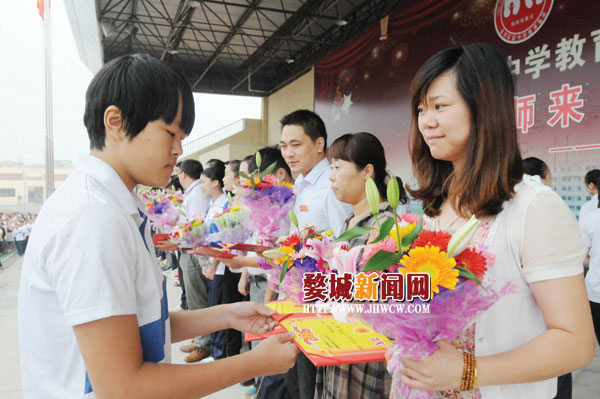 为庆祝第29个教师节,9月6日,实验中学的优秀学生代表给全校80名优秀教师颁奖。这些在上一学年中被评为管理岗位能手、教学科研能手的受表彰教师在6000多名学生的掌声中,开心地接受鲜花和祝福:“老师,辛苦了!”