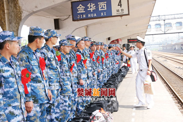 昨天上午10点50分,金华市2013年度新兵入伍欢送仪式在金华火车西站举行。现场,新兵身穿海、陆军装,胸戴光荣花,在亲人和朋友的美好祝福中,婺城区首批194名新兵将奔赴军营。