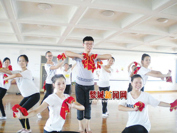 舞蹈的排练被安排在科技楼六楼的舞蹈房。音乐响起来,甩手帕、抬手、踢腿、扭腰,每一个姿势都做得很到位,一段舞蹈下来,衣服已经全部湿透了。但是他们毫无怨言,休息会儿继续跳。