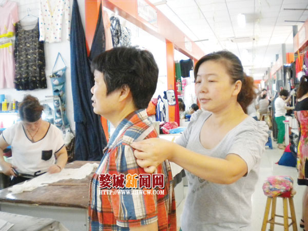 谈话间,一位身材丰满的女士进来拿自己之前在这里定做的衣服。为了让她穿起来好看点,在顾客要求的基础上,老板娘进行了简单的修改。一问价格,布料加上手工费也就150元钱。“我们这边比商场的要便宜很多呢,喜欢自己买布料做衣服的都会来我们这里。”