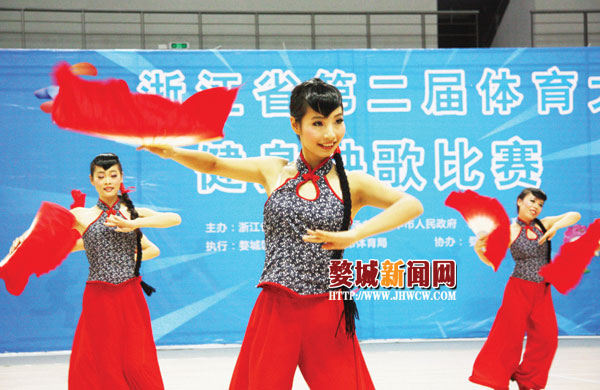 昨日上午,2013年浙江省第二届体育大会健身秧歌大赛在金华市体育中心拉开帷幕,比赛在欢快、热闹的音乐声中进行。