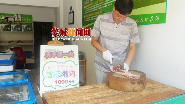 对此,施师傅自豪地说:“金华‘两头乌’猪肉可是好东西,一个月前还上央视了呢。我们店打出‘天下第一肉’的招牌,雪花猪肉产量少是一方面原因,主要也是为了给金华‘两头乌’打个响亮点的广告,让更多的人了解‘两头乌’猪肉。”