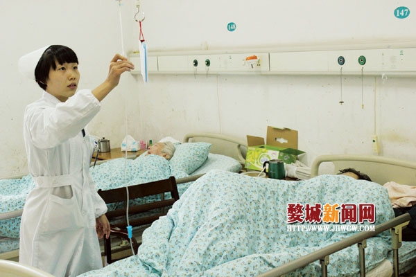 周怡说,虽然在这里不用担心碰到脾气古怪的老人,但相对于九病区而言,上护理班的她反而变得更加忙碌。每天,她需要多次来回穿梭在各个病房,给病房里的病人打吊瓶、喂鼻饲。周怡笑着说,在七病区工作一年下来,感觉自己每天都在不停地奔走,同事有时在一起会开玩笑说,每个人走的路如果加起来,用不了几年就能绕地球一周了。