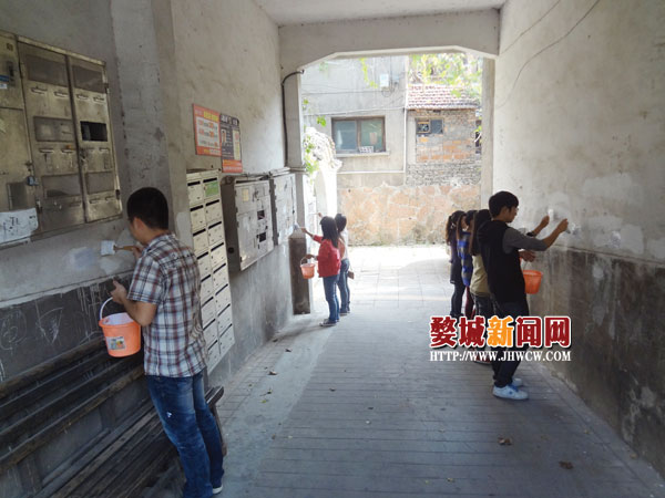 近日,城北街道郑岗山社区组织浙师大的10余名学生志愿者,深入到辖区居民楼开展清理牛皮癣、美化社区环境活动。