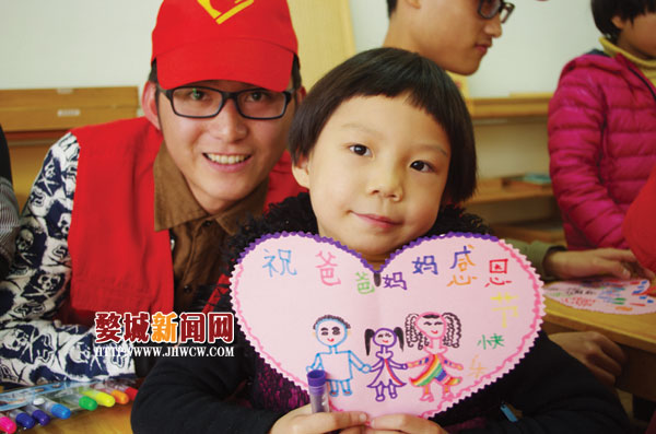 11月26日下午,金华职业技术学院建筑工程学院的学生志愿者来到市区艺术幼儿园,和孩子们一起开展“感恩父母于心,快乐成长同行”感恩系列活动。活动中,志愿者与孩子们一起动手制作心型感恩贺卡,让孩子通过自己的努力给家长们送上一份特殊的感恩节礼物。